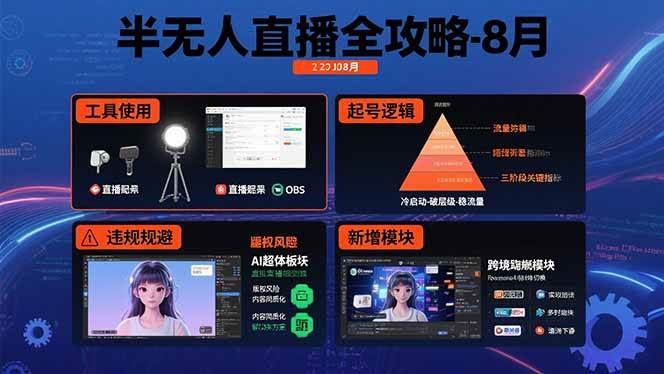 半无人直播课程是一套覆盖直播带货全链路的实战体系,从基础搭建到高阶运营,聚焦抖音、快手、视频号等平台。课程以技术工具+流量玩法+合规避坑为核心,包含直播助手操作(如百川AI超体)、无人直播起号(自然流/微付费)、女装等品类专项(选品、剪辑、话术),并延伸至TikTok跨境带货(账号养号、佣金玩法)。2025年新增千川投流顺烧、卡广场/团购起号等实战技巧,通过连麦答疑解决搭建与违规问题,适配新手至进阶从业者。