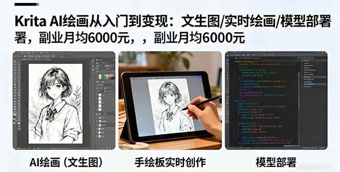 本课程为Krita AI绘画入门课,专为0基础学员设计,涵盖软件安装、本地/云端部署、文生图、实时绘画等核心功能,重点讲解Deepseek大模型应用、人物一致性控制及提示词技巧。课程结合短视频变现、小说推文等实战案例,教授从工具操作到商业落地的全流程,帮助学员快速掌握AI绘画技能,实现月入5000+的变现目标(如小说推文单篇收益200-800元、短视频广告分成等)。