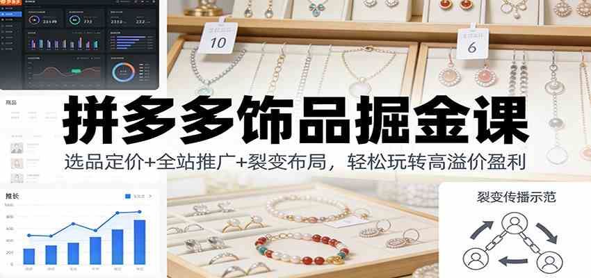 本课程为《拼多多打爆班原创高阶技术第53期:拼多多饰品项目》,专门聚焦高溢价、高转化的饰品类目。课程系统讲解了从选品(按人群/风格)、高溢价定价策略,到精细化与铺货式运营两种打法的全流程。核心内容包括利用全站推广赛马测款、数据筛选、优质款的“3件套”打造与裂变、每日链接上新布局、“进2退1”的持续迭代策略、第二阶段数据优化,以及全店托管与店铺矩阵的最终盈利模型。课程强调“好产品+好技术”的结合,旨在实现饰品类目的高利润爆款打造与规模化盈利。