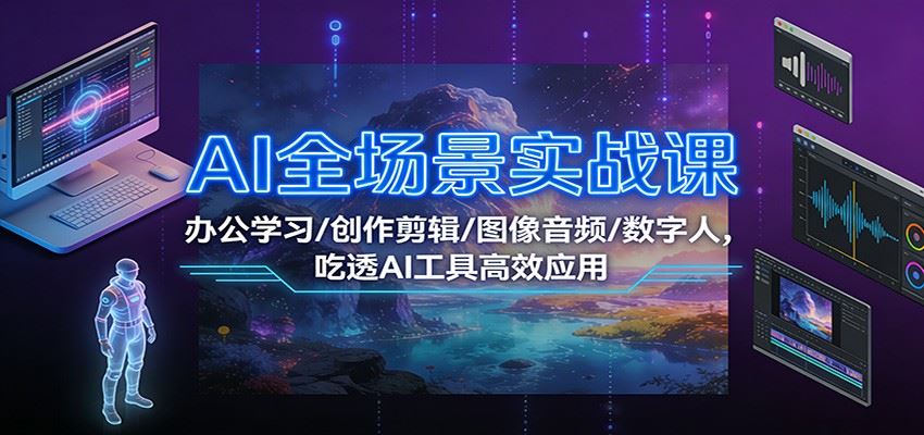 本套全场景 AI 全能实战课,零基础友好,覆盖 AI 工具全维度应用干货,适配学习、办公、创作多场景需求。课程从 PC / 手机端 AI 工具基础使用入手,讲解大语言模型底层逻辑与 GPT 高效调教技巧,解答 AI 职场应用核心疑问。核心涵盖 AI 学习提分、公文 / 带货文案写作等文字创作技巧,也有 Excel 处理、多工具一键生成 PPT、会议纪要总结等智能办公能力;还解锁 AI 图像修复、扩图、写真创作、模特换衣,音频克隆、变声,以及短视频制作、数字人互动、古诗词创作等爆款玩法,外加 Deepseek 全场景应用与本地部署技巧。全程干货落地,手把手教你吃透全品类 AI 工具,高效赋能学习与工作。