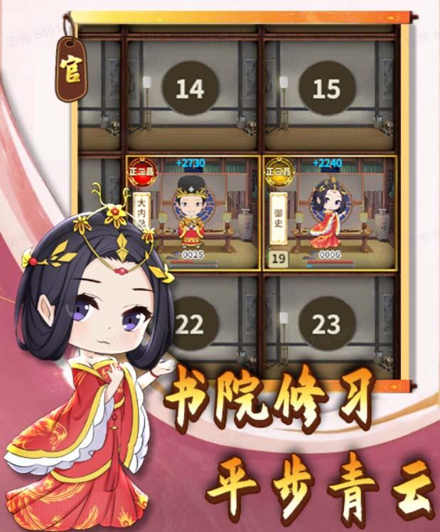养成:用户通过持续观看直播即可提升角色经验值,经验值满足要求后,角色自动考核升官至下一官职;每局玩法结束后,会有荣誉榜展示官职最高的前20名用户。