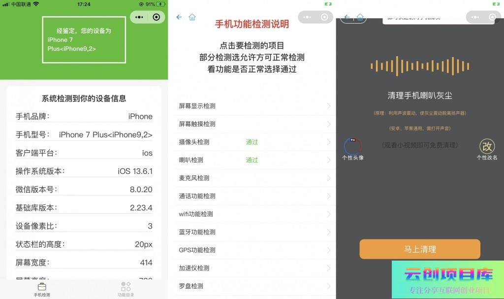 手机配置在线检测工具微信小程序源码云创智库4月5日 21:14发布关注1364 手机配置在线检测工具微信小程序源码,这是一款升级版检测工具,自动检测手机真伪,序列号等。另外还可以给手机检测各项功能是否正常。 由于能检测的项目太多,所以大家到时候自行研究吧。另外支持多做流量主模式,还有外卖CPS,和友情小程序推荐等! 手机配置在线检测工具微信小程序源码此内容为免费资源,请登录后查看🪙糖果0 登录查看免费资源© 版权声明 免责声明 ◎本站所发布的全部内容源于互联网(包括源代码、软件、学习资料等)本站提供的一切软件、教程和内容信息仅限用于学习和研究目的;不得将上述内容用于商业或者非法用途,否则一切后果请用户自负。宝藏云创对所提供下载的软件和程序代码不拥有任何权利,其版权归该软件和程序代码的合法拥有者所有,网页信息来自网络收集整理,版权争议与本站无关。如果您喜欢该程序和内容,请支持正版,购买注册,得到更好的正版服务。我们非常重视版权问题,如本站不慎侵犯您的版权请联系我们,我们将及时处理,并撤下相关内容!敬请谅解! 侵删请致信E-mail:2754908705@qq.com ◎云创项目库作为信息共享平台我们无法对信息的真实性及准确性做出判断,风险请各位自行甄别。我们不承担任何财产损失和法律责任,若您不同意该提示,请关闭网页且不要在本站拓展任何合作,否则在使用过程中造成的任何损失由您个人承担。本站发布的所有资源不代表本站赞同其观点和对其完整性、真实性、可用性负责 如遇到加密压缩包,请使用WINRAR解压,如遇到无法解压的请联系管理员! THE END小程序源码# 小程序 收藏
