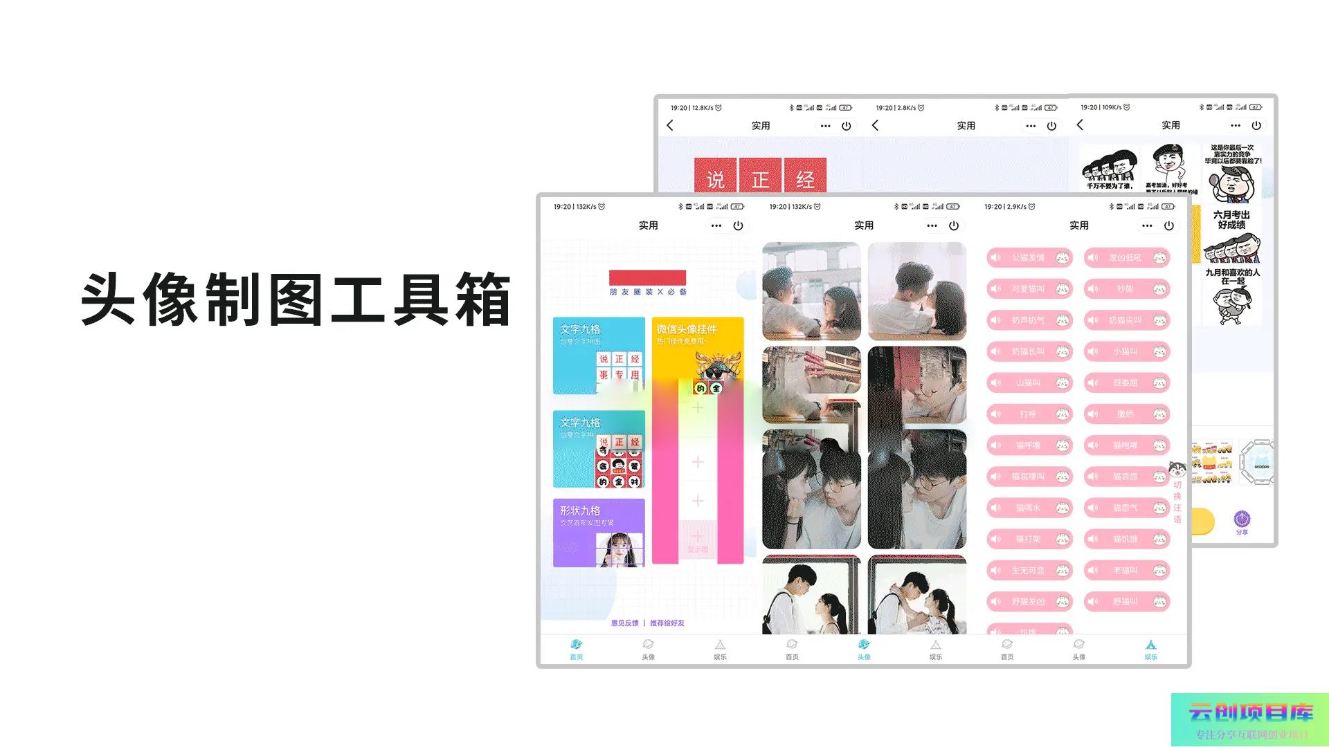 主要功能有文字九格、头像挂件生成、爆趣九宫格、形状九宫格、创意长图、情侣头像、猫狗交流器。