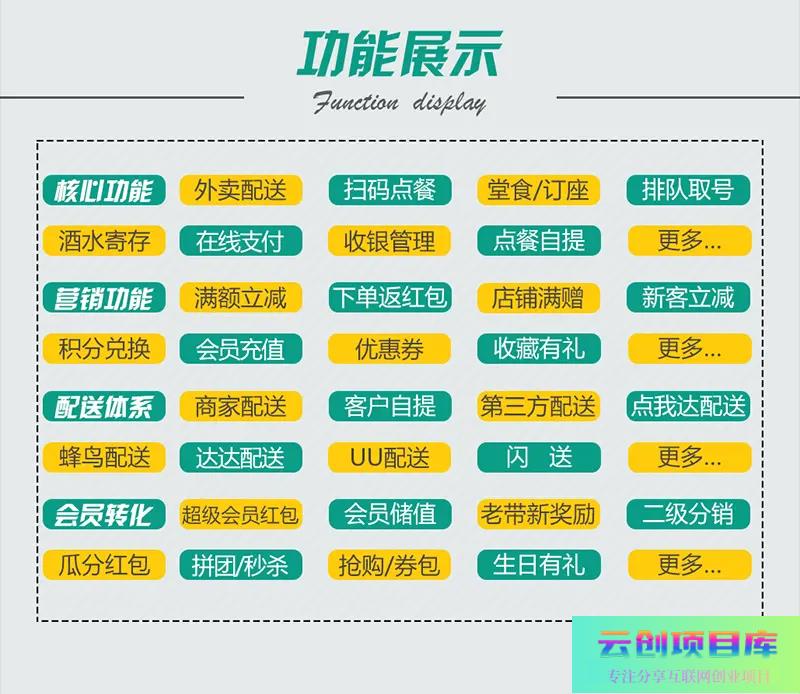 DIY装修、多门店、单门店、连锁加盟店、扫码点餐、拼桌点餐、多人点餐、服务费、打印机、商品导入、微信支付、服务商支付、代付功能、货到付款、会员等级、支付有礼、店铺满赠、订单语音提醒、商家配送、达达配送、点我达、顺丰同城、蜂鸟即配