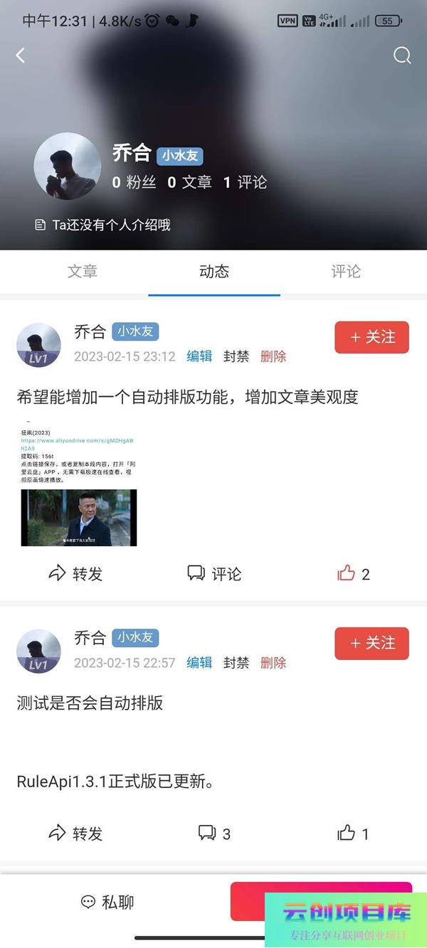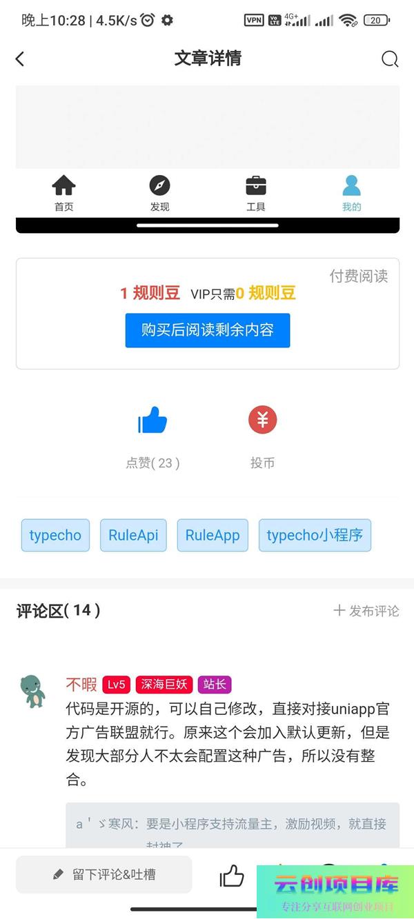 RuleApp1.4.0:一款文章社区客户端,支持收费阅读和富文本创作,可打包为安卓、苹果和小程序云创智库4月5日 22:23发布关注1739 该客户端为一款功能强大的文章/社区/自媒体平台,支持安卓、苹果和小程序打包。主要包含文章模块、用户模块、支付模块、聊天模块和商城模块等基础功能,并带有VIP会员、付费阅读等收费体系。同时,用户可以发布文章、动态、商品、视频和图片等多种内容。 RuleApp1.4.0:一款文章社区客户端,支持收费阅读和富文本创作,可打包为安卓、苹果和小程序此内容为免费资源,请登录后查看🪙糖果0 登录查看免费资源© 版权声明 免责声明 ◎本站所发布的全部内容源于互联网(包括源代码、软件、学习资料等)本站提供的一切软件、教程和内容信息仅限用于学习和研究目的;不得将上述内容用于商业或者非法用途,否则一切后果请用户自负。宝藏云创对所提供下载的软件和程序代码不拥有任何权利,其版权归该软件和程序代码的合法拥有者所有,网页信息来自网络收集整理,版权争议与本站无关。如果您喜欢该程序和内容,请支持正版,购买注册,得到更好的正版服务。我们非常重视版权问题,如本站不慎侵犯您的版权请联系我们,我们将及时处理,并撤下相关内容!敬请谅解! 侵删请致信E-mail:2754908705@qq.com ◎云创项目库作为信息共享平台我们无法对信息的真实性及准确性做出判断,风险请各位自行甄别。我们不承担任何财产损失和法律责任,若您不同意该提示,请关闭网页且不要在本站拓展任何合作,否则在使用过程中造成的任何损失由您个人承担。本站发布的所有资源不代表本站赞同其观点和对其完整性、真实性、可用性负责 如遇到加密压缩包,请使用WINRAR解压,如遇到无法解压的请联系管理员! THE END网页/APP# IApp源码 收藏