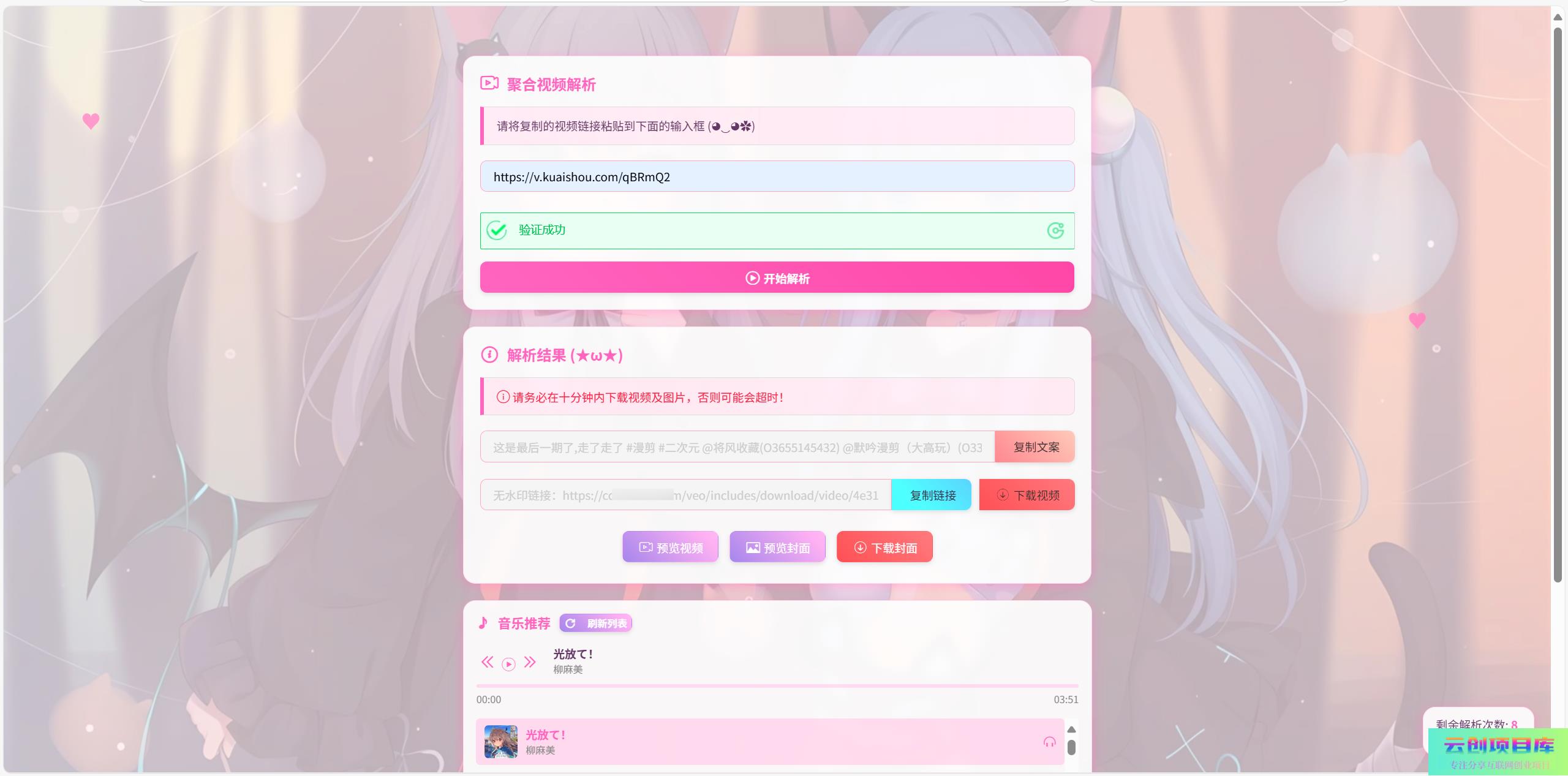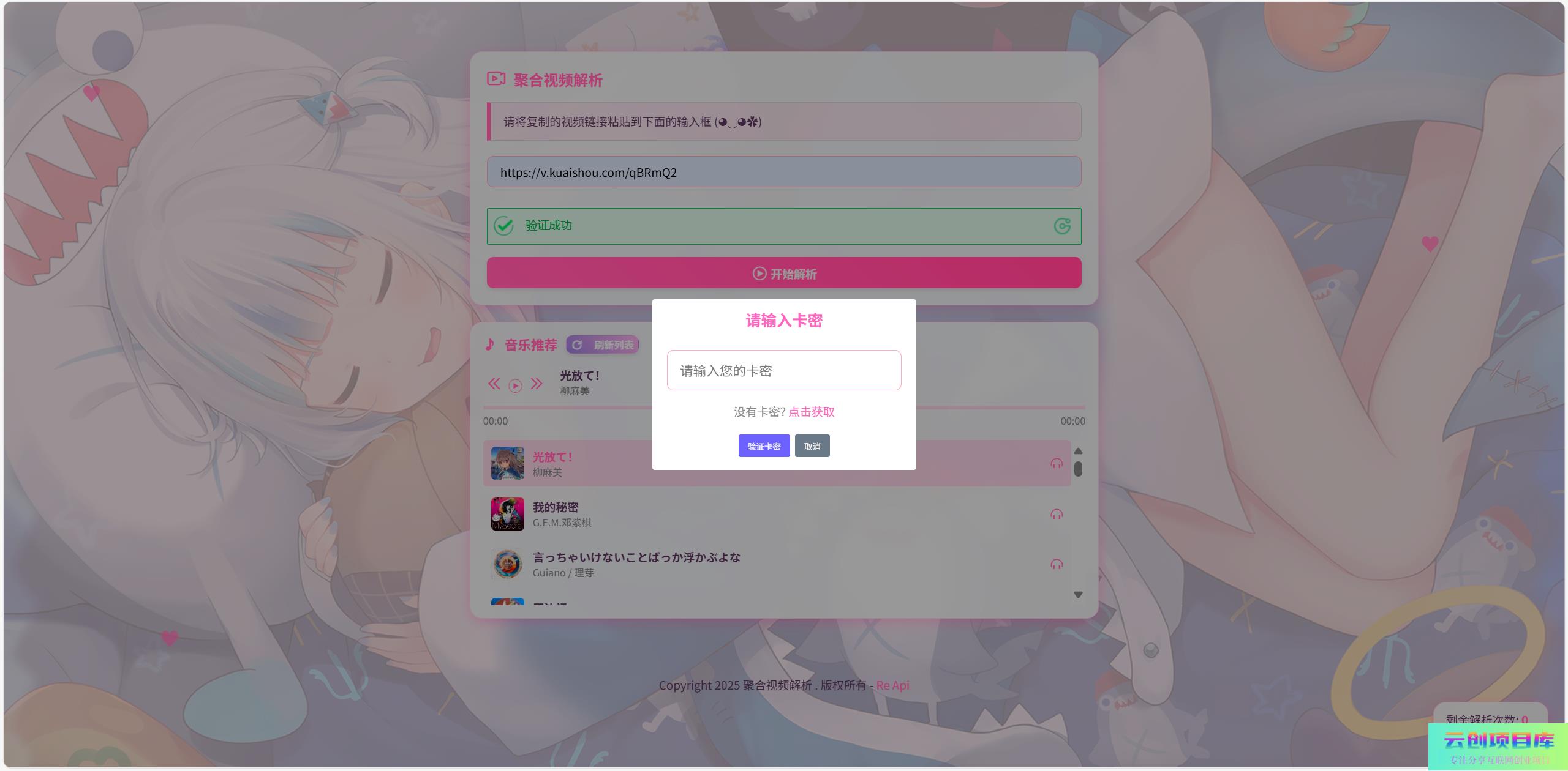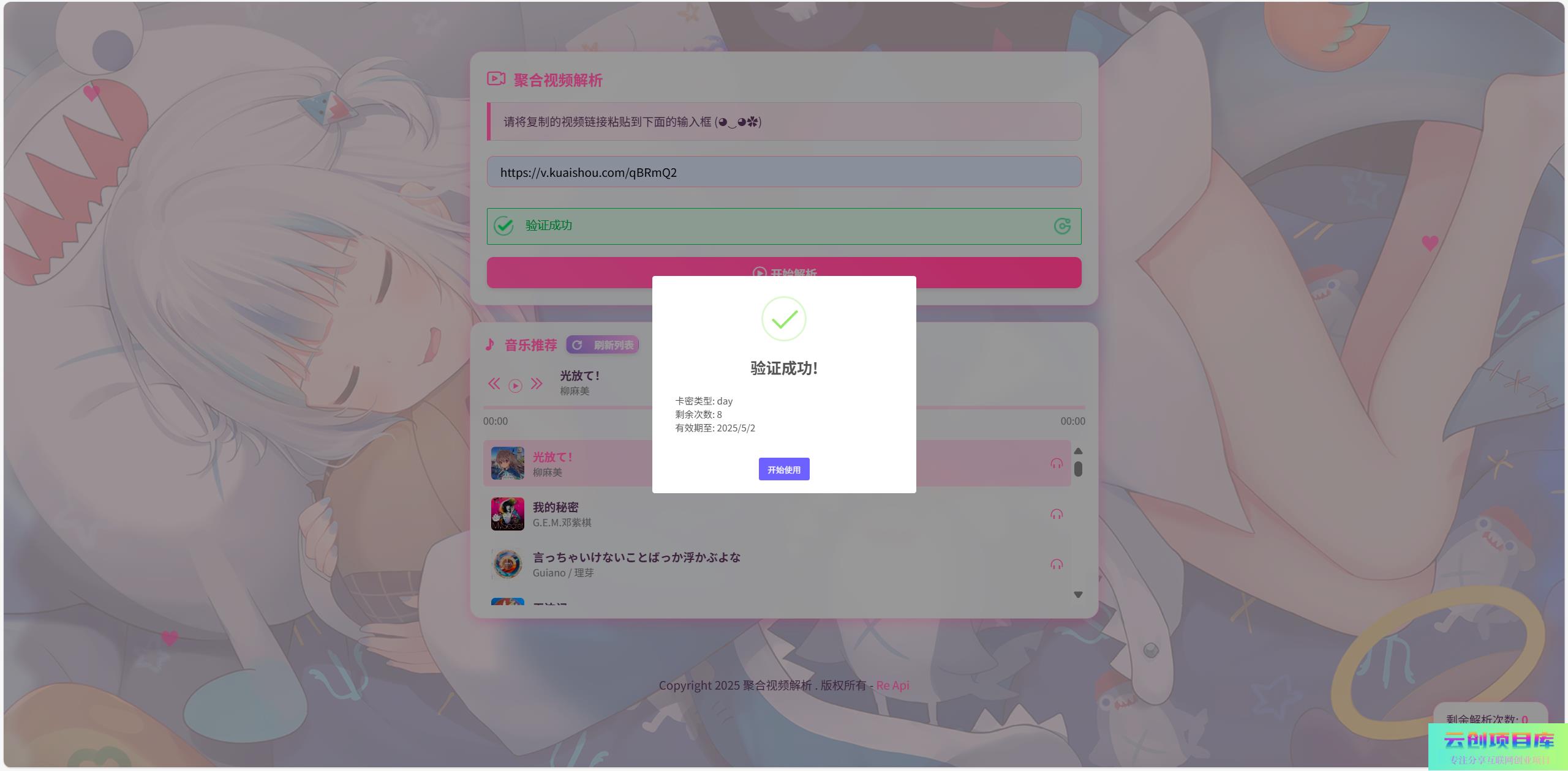 二次元短视频解析系统带卡密验证云创智库4月5日 23:31更新关注3010 最新二次元短视频解析系统带卡密验证 在此基础还有一个后台 不过是可以直接进的有能力的可以自己改一下~ 然后配置的所有东西都在/includes/config.php里面 二次元短视频解析系统带卡密验证此内容为免费资源,请登录后查看🪙糖果0 登录查看免费资源© 版权声明 免责声明 ◎本站所发布的全部内容源于互联网(包括源代码、软件、学习资料等)本站提供的一切软件、教程和内容信息仅限用于学习和研究目的;不得将上述内容用于商业或者非法用途,否则一切后果请用户自负。宝藏云创对所提供下载的软件和程序代码不拥有任何权利,其版权归该软件和程序代码的合法拥有者所有,网页信息来自网络收集整理,版权争议与本站无关。如果您喜欢该程序和内容,请支持正版,购买注册,得到更好的正版服务。我们非常重视版权问题,如本站不慎侵犯您的版权请联系我们,我们将及时处理,并撤下相关内容!敬请谅解! 侵删请致信E-mail:2754908705@qq.com ◎云创项目库作为信息共享平台我们无法对信息的真实性及准确性做出判断,风险请各位自行甄别。我们不承担任何财产损失和法律责任,若您不同意该提示,请关闭网页且不要在本站拓展任何合作,否则在使用过程中造成的任何损失由您个人承担。本站发布的所有资源不代表本站赞同其观点和对其完整性、真实性、可用性负责 如遇到加密压缩包,请使用WINRAR解压,如遇到无法解压的请联系管理员! THE END网页/APP# 垂直行业 收藏