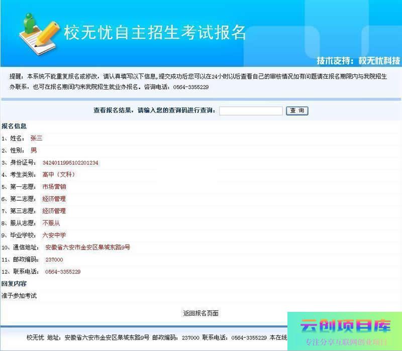 校无忧在线报名系统为了满足各地不同的报名人员的需求,为提供更为高效、方便、快捷的报名条件,同时也为减轻管理人员的工作难度;更为协调报名人员与管理人员的关系,快速提高了报名人员与管理人员的工作效率应运而生。系统适用于政府、教育机构、学校、企事业单位在互联网上进行活动参与和信息收集的网上报名平台。