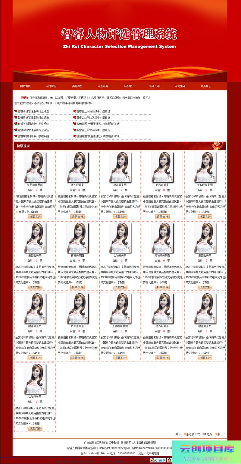 智睿投票系统人物微信投票系统,微信公众号投票系统定位于投票评选行业的量身开发,打造行业的领先服务评选品牌,系统整合单选/多选一体化功能,系统支持手机H5移动访问及电脑自适应切换。并适合图文评选,适合用于大型媒体单位、机关单位、院校机构、集团公司、门户网站可用于城市评选、美景评选、优秀人物评选、活动评选,事迹评选。