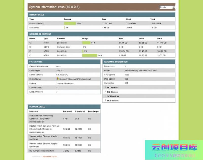 phpSysInfo是基于apache和php,简单监测服务器状态,包括服务器使用的系统,核心版本,服务器硬件信息详细信息,同时还有网络设备的使用情况,以及内存的使用情况,磁盘信息等,在页面最顶端可以选择页面的风格以及语言。
