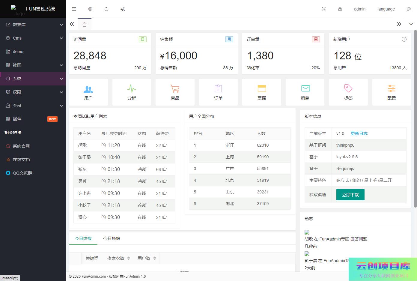 FunAdmin后台开发系统是一个基于thinkphp6 +Layui2.6.*+requirejs开发的权限(RBAC)管理框架,框架中集成了权限管理、模块管理、插件管理、后台支持多主题切换、配置管理、会员管理等常用功能模块,以方便开发者快速构建自己的应用。框架专注于为中小企业提供最佳的行业基础后台框架解决方案,执行效率、扩展性、稳定性值得信赖,操作体验流畅,使用非常优化,欢迎大家使用及进行二次开发。