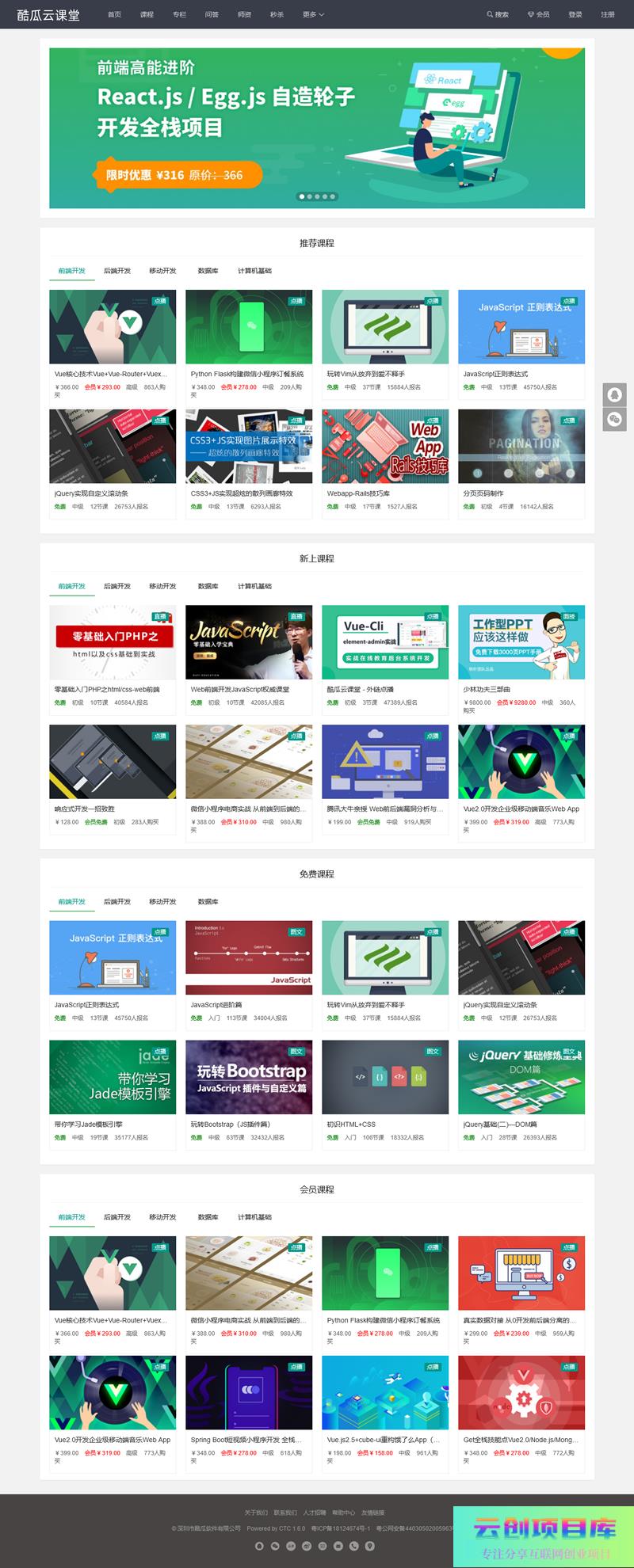 实现了点播、直播、专栏、会员、积分、秒杀、微聊等。