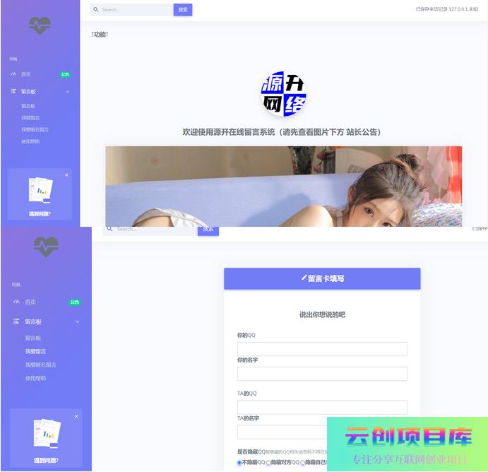 在线留言系统源码 表白墙系统二开云创智库4月18日 04:51发布关注2181 本系统为某位大佬的表白墙系统二开,嘎嘎简单,仅做了很简单的改变 改成了留言墙了 先看图 老规矩 下载链接放最下边 在线留言系统源码 表白墙系统二开此内容为免费资源,请登录后查看🪙糖果0 登录查看免费资源© 版权声明 免责声明 ◎本站所发布的全部内容源于互联网(包括源代码、软件、学习资料等)本站提供的一切软件、教程和内容信息仅限用于学习和研究目的;不得将上述内容用于商业或者非法用途,否则一切后果请用户自负。宝藏云创对所提供下载的软件和程序代码不拥有任何权利,其版权归该软件和程序代码的合法拥有者所有,网页信息来自网络收集整理,版权争议与本站无关。如果您喜欢该程序和内容,请支持正版,购买注册,得到更好的正版服务。我们非常重视版权问题,如本站不慎侵犯您的版权请联系我们,我们将及时处理,并撤下相关内容!敬请谅解! 侵删请致信E-mail:2754908705@qq.com ◎云创项目库作为信息共享平台我们无法对信息的真实性及准确性做出判断,风险请各位自行甄别。我们不承担任何财产损失和法律责任,若您不同意该提示,请关闭网页且不要在本站拓展任何合作,否则在使用过程中造成的任何损失由您个人承担。本站发布的所有资源不代表本站赞同其观点和对其完整性、真实性、可用性负责 如遇到加密压缩包,请使用WINRAR解压,如遇到无法解压的请联系管理员! THE END网页/APP# 留言日记 收藏