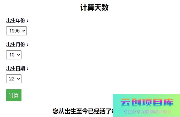 计算出生至今活了多少天引流HTML页面云创智库4月18日 04:52发布关注1618 引流HTML单页面,选择出生年月日,然后计算出自己从出生至今活了多天。 单页面,下载源码上传自己服务器即可。 计算出生至今活了多少天引流HTML页面此内容为免费资源,请登录后查看🪙糖果0 登录查看免费资源© 版权声明 免责声明 ◎本站所发布的全部内容源于互联网(包括源代码、软件、学习资料等)本站提供的一切软件、教程和内容信息仅限用于学习和研究目的;不得将上述内容用于商业或者非法用途,否则一切后果请用户自负。宝藏云创对所提供下载的软件和程序代码不拥有任何权利,其版权归该软件和程序代码的合法拥有者所有,网页信息来自网络收集整理,版权争议与本站无关。如果您喜欢该程序和内容,请支持正版,购买注册,得到更好的正版服务。我们非常重视版权问题,如本站不慎侵犯您的版权请联系我们,我们将及时处理,并撤下相关内容!敬请谅解! 侵删请致信E-mail:2754908705@qq.com ◎云创项目库作为信息共享平台我们无法对信息的真实性及准确性做出判断,风险请各位自行甄别。我们不承担任何财产损失和法律责任,若您不同意该提示,请关闭网页且不要在本站拓展任何合作,否则在使用过程中造成的任何损失由您个人承担。本站发布的所有资源不代表本站赞同其观点和对其完整性、真实性、可用性负责 如遇到加密压缩包,请使用WINRAR解压,如遇到无法解压的请联系管理员! THE END网页/APP# 搜索/查询 收藏