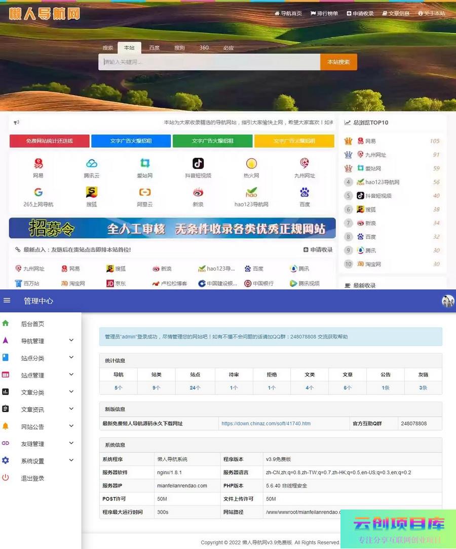 自适应各终端懒人网址导航源码v3.9云创智库4月18日 04:54发布关注2718 自适应各终端懒人网址导航源码是一个以PHP+MySQL进行开发的网址导航源码。此版本是在原3.8版本的基础上修复和增加了些功能。新 人推荐直接使用新版本,舍弃旧版本,会二次开发的请对照后自行升级,后期会继续不定期更新。测试环境 宝塔Nginx -Tengine2.2.3 自适应各终端懒人网址导航源码v3.9此内容为免费资源,请登录后查看🪙糖果0 登录查看免费资源© 版权声明 免责声明 ◎本站所发布的全部内容源于互联网(包括源代码、软件、学习资料等)本站提供的一切软件、教程和内容信息仅限用于学习和研究目的;不得将上述内容用于商业或者非法用途,否则一切后果请用户自负。宝藏云创对所提供下载的软件和程序代码不拥有任何权利,其版权归该软件和程序代码的合法拥有者所有,网页信息来自网络收集整理,版权争议与本站无关。如果您喜欢该程序和内容,请支持正版,购买注册,得到更好的正版服务。我们非常重视版权问题,如本站不慎侵犯您的版权请联系我们,我们将及时处理,并撤下相关内容!敬请谅解! 侵删请致信E-mail:2754908705@qq.com ◎云创项目库作为信息共享平台我们无法对信息的真实性及准确性做出判断,风险请各位自行甄别。我们不承担任何财产损失和法律责任,若您不同意该提示,请关闭网页且不要在本站拓展任何合作,否则在使用过程中造成的任何损失由您个人承担。本站发布的所有资源不代表本站赞同其观点和对其完整性、真实性、可用性负责 如遇到加密压缩包,请使用WINRAR解压,如遇到无法解压的请联系管理员! THE END网页/APP# 搜索/查询 收藏