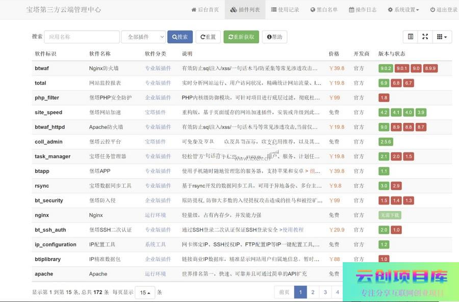 网站后台管理可一键同步宝塔官方的插件列表与增量更新插件包,还有云端使用记录、IP黑白名单、操作日志、定时任务等功能。