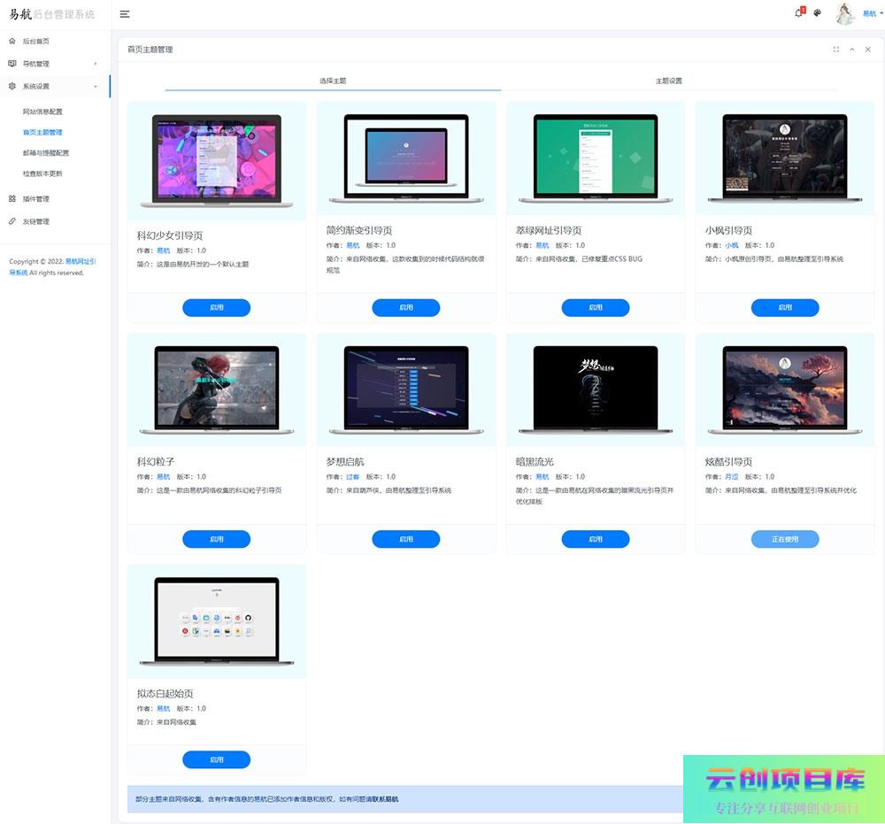 易航自主开发了一款极其优雅的易航网址引导页管理系统,后台采用全新的光年 v5 模板开发。该系统完全开源,摒弃了后门风险,可以管理无数个引导页主题。数据管理采用易航原创的JsonDb数据包,无需复杂的安装解压过程即可使用。目前系统内置了8套模板,并且可以进行自定义设置。另外,系统还内置了硬防洪和硬防墙插件,有效解决了域名安全的忧虑。