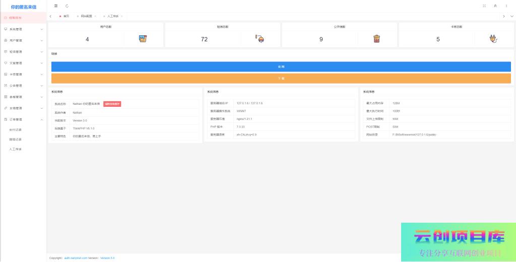 运行环境要求PHP 73,MySQL5.6,运行目录:public,伪静态:ThinkPHP,PHP拓展:fileinfo