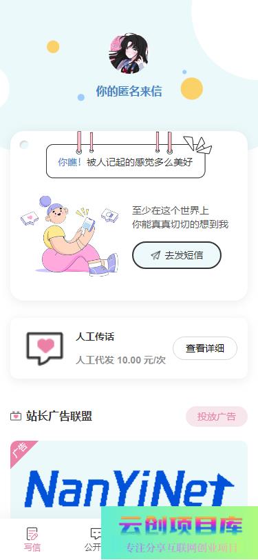 你的匿名来信H5一封你的来信源码/表白祝福短信程序/往来信/传话短信源码支持邮件发信与手机短信发信“你的匿名来信”是最近某音上爆火的一个活动话题,可以通过H5网站,编辑自己想要对某人说的话或者祝福,网站会把您想说的发给您预留的号码,特定话题。
