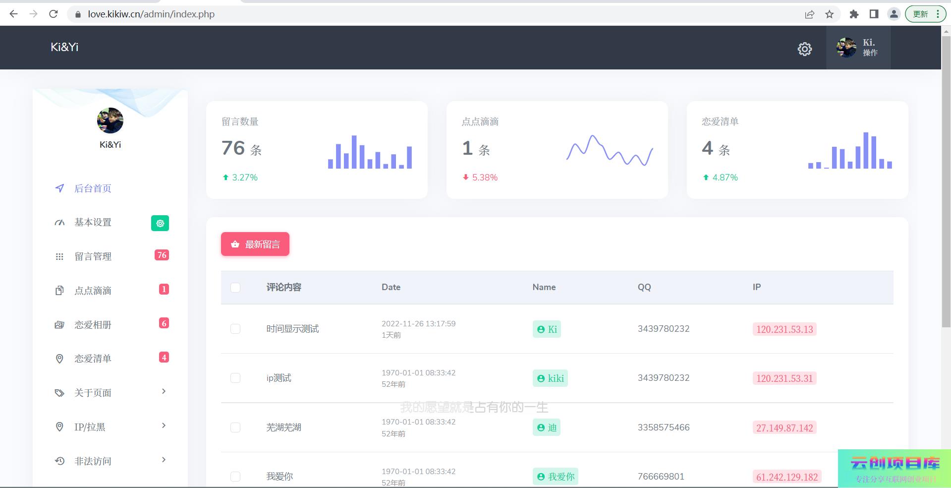 前后端都是使用了 grid 栅格 flex 弹性布局 高斯模糊效果 前端简约配色没有过多的复杂效果前端首页分四个子页面 点点滴滴 留言板 关于我们 恋爱列表LikeGirl 5.1.0调整前端点点滴滴页面内容标签样式调整前端留言祝福页面留言卡片、留言信息输入框样式调整前端恋爱事件PC端卡片显示宽度调整后台首页数据统计图标修复前端多处存在文本内容溢出问题新增恋爱事件标题支持