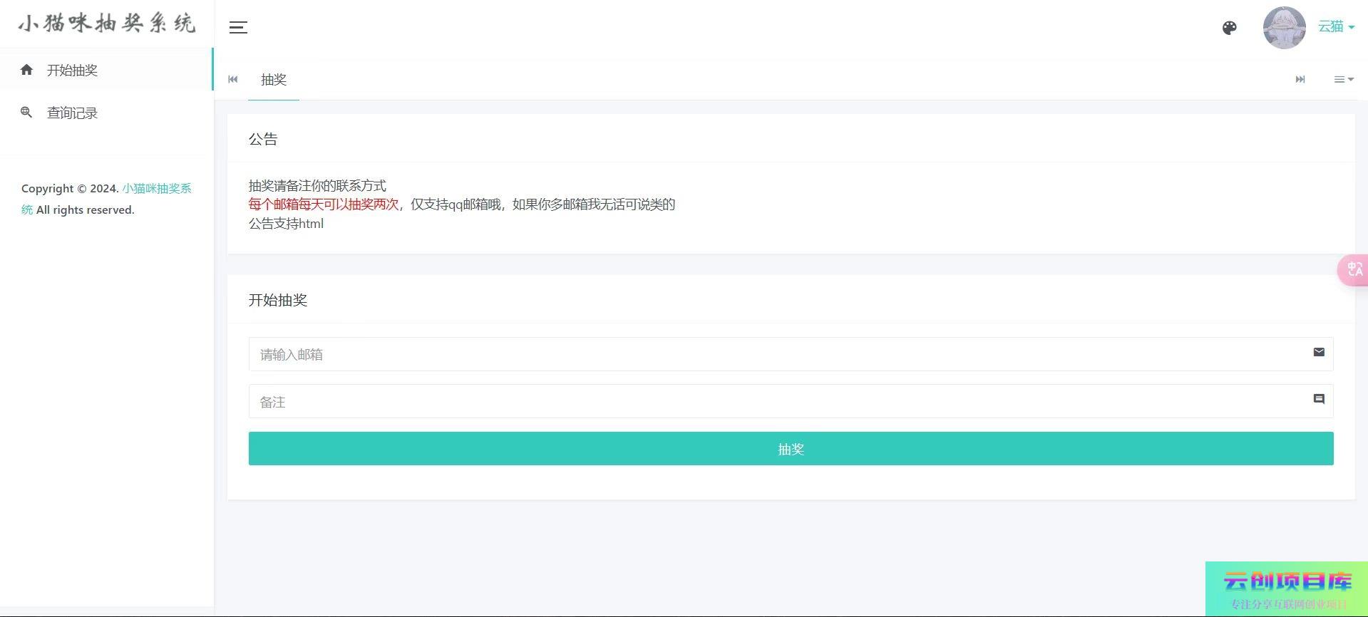 小猫咪抽奖系统1.11(有卡密功能)云创智库4月18日 05:00发布关注1125 一个可以用于抽奖的源码,用于公司年会,节日活动抽奖,支持自定义奖品中奖概率和奖品数量,支持设置单个账号抽奖次数,支持限制抽奖邮箱类型(如限制只能使用qq邮箱等),支持邮箱验证抽奖账户,支持自定义公告 小猫咪抽奖系统1.11(有卡密功能)此内容为免费资源,请登录后查看🪙糖果0 登录查看免费资源© 版权声明 免责声明 ◎本站所发布的全部内容源于互联网(包括源代码、软件、学习资料等)本站提供的一切软件、教程和内容信息仅限用于学习和研究目的;不得将上述内容用于商业或者非法用途,否则一切后果请用户自负。宝藏云创对所提供下载的软件和程序代码不拥有任何权利,其版权归该软件和程序代码的合法拥有者所有,网页信息来自网络收集整理,版权争议与本站无关。如果您喜欢该程序和内容,请支持正版,购买注册,得到更好的正版服务。我们非常重视版权问题,如本站不慎侵犯您的版权请联系我们,我们将及时处理,并撤下相关内容!敬请谅解! 侵删请致信E-mail:2754908705@qq.com ◎云创项目库作为信息共享平台我们无法对信息的真实性及准确性做出判断,风险请各位自行甄别。我们不承担任何财产损失和法律责任,若您不同意该提示,请关闭网页且不要在本站拓展任何合作,否则在使用过程中造成的任何损失由您个人承担。本站发布的所有资源不代表本站赞同其观点和对其完整性、真实性、可用性负责 如遇到加密压缩包,请使用WINRAR解压,如遇到无法解压的请联系管理员! THE END网页/APP# 游戏娱乐 收藏