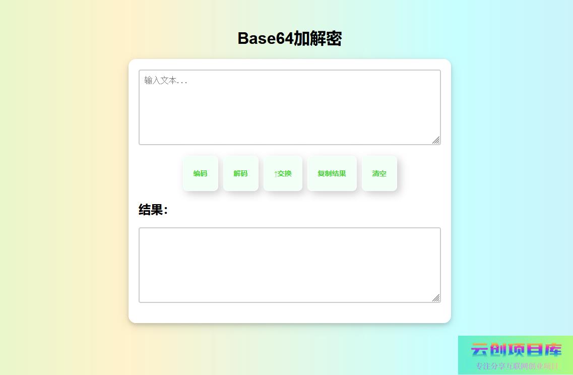 在线Base64加解密HTML源码云创智库4月18日 05:00发布关注2844 Base64加解密HTML自己编写的添加了pc端和手机端自适应, 反复测试过没有任何问题现在分享给各位,渐变背景我已经在源码里标注自行效果。 在线Base64加解密HTML源码此内容为免费资源,请登录后查看🪙糖果0 登录查看免费资源© 版权声明 免责声明 ◎本站所发布的全部内容源于互联网(包括源代码、软件、学习资料等)本站提供的一切软件、教程和内容信息仅限用于学习和研究目的;不得将上述内容用于商业或者非法用途,否则一切后果请用户自负。宝藏云创对所提供下载的软件和程序代码不拥有任何权利,其版权归该软件和程序代码的合法拥有者所有,网页信息来自网络收集整理,版权争议与本站无关。如果您喜欢该程序和内容,请支持正版,购买注册,得到更好的正版服务。我们非常重视版权问题,如本站不慎侵犯您的版权请联系我们,我们将及时处理,并撤下相关内容!敬请谅解! 侵删请致信E-mail:2754908705@qq.com ◎云创项目库作为信息共享平台我们无法对信息的真实性及准确性做出判断,风险请各位自行甄别。我们不承担任何财产损失和法律责任,若您不同意该提示,请关闭网页且不要在本站拓展任何合作,否则在使用过程中造成的任何损失由您个人承担。本站发布的所有资源不代表本站赞同其观点和对其完整性、真实性、可用性负责 如遇到加密压缩包,请使用WINRAR解压,如遇到无法解压的请联系管理员! THE END网页/APP# 文件管理# 编辑器# 应用工具 收藏