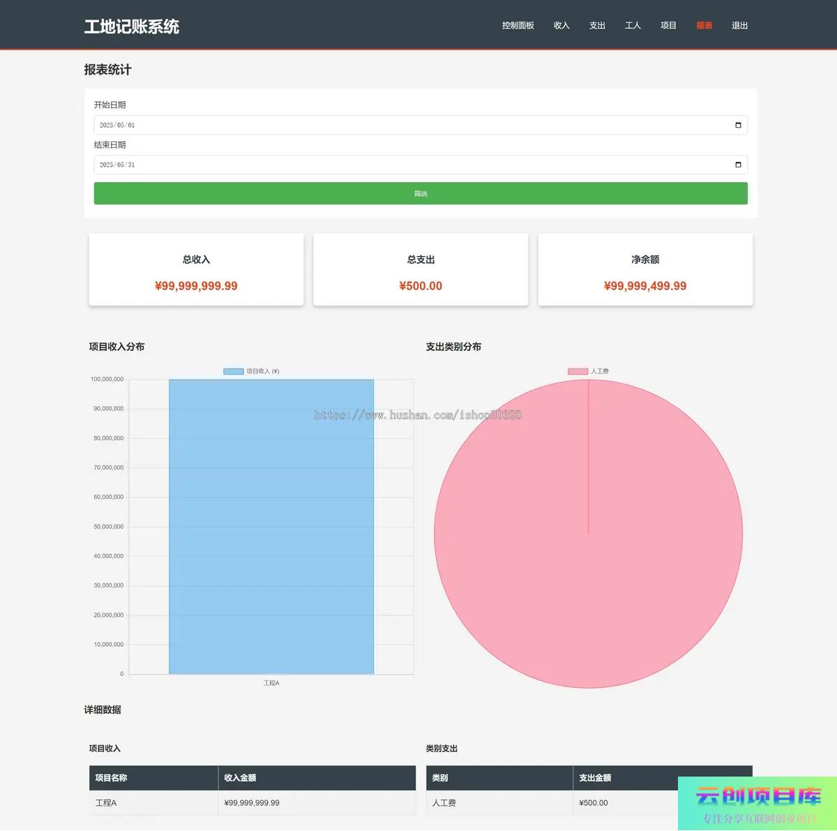实时生成「项目收益分析」「工人成本占比」「支出类别排行」等关键数据
