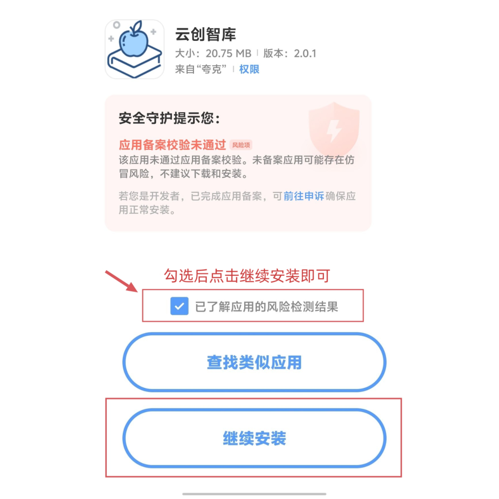 苹果IOS请在Safari或夸克浏览器收藏使用 ☑2025.8.11云创智库apk 快速下载 (直接安装) ☑2025.8.11云创智库apk 备用下载 (转存安装) 1.1-安装注意事项由于未上架应用商店和进行备案,部分机型会有提示属正常情况忽略即可,下载后可直接勾选点击安装 1.2–游戏下载教程:首次安装给应用权限才能在APP内弹出安装页面 演示图: